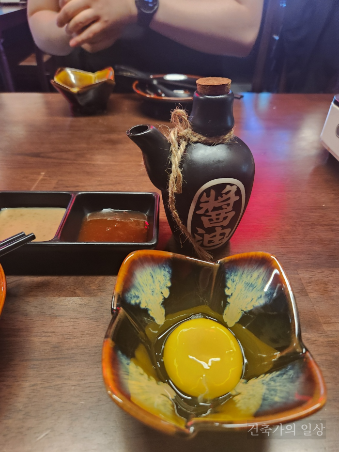 계란노른자에 사장님이 준비한 특제 샤브소스를 섞어서 찍어먹으면 이게 아주 맛있다.